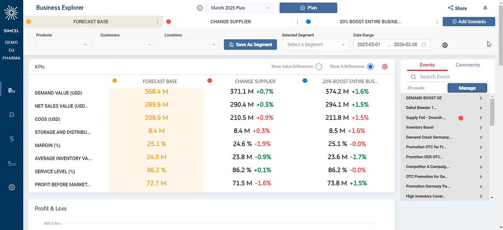 Simulate the real impact of promotions, disruptions, or market shifts with event-driven scenarios—built at transaction-level granularity. Instantly understand how internal or external events ripple through demand, supply, and profitability, so you can respond with precision—not react blindly.